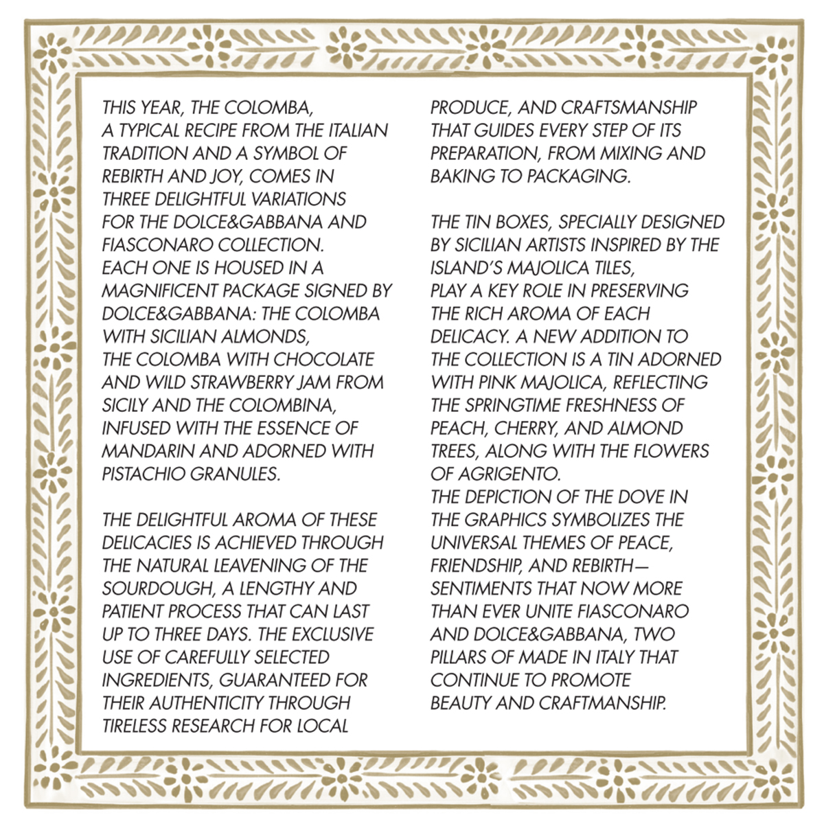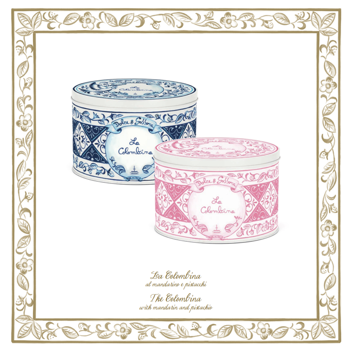 Όπως κάθε χρόνο Dolce & Gabbana και Fiasconaro, ετοίμασαν μια τυπική συνταγή της ιταλικής παράδοσης και σύμβολο αναγέννησης και χαράς. Η υπέροχη συσκευασία σχεδιασμένη από τους Dolce & Gabbana και είναι εμπνευσμένα από τα μαναδικά Σικελιανά σχέδια σε πλακάκι Στη συλλογή προστέθηκε το νέο κουτι διακοσμημένο με ροζ σχέδια, που αντανακλούν την ανοιξιάτικη φρεσκάδα των ροδακινιών, των κερασιών και των αμυγδαλιών, μαζί με τα λουλούδια του Agrigento. Colomba με άρωμα μανταρινιού, γλάσο αμύγδαλου και φιστικιού, διακοσμημένη με ζάχαρη και φιστίκια. **Κατά την παραγγελία σας παρακαλούμε διευκρινίστε μας στα σχόλια ποιο χρώμα επιθυμείτε.